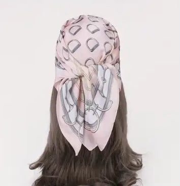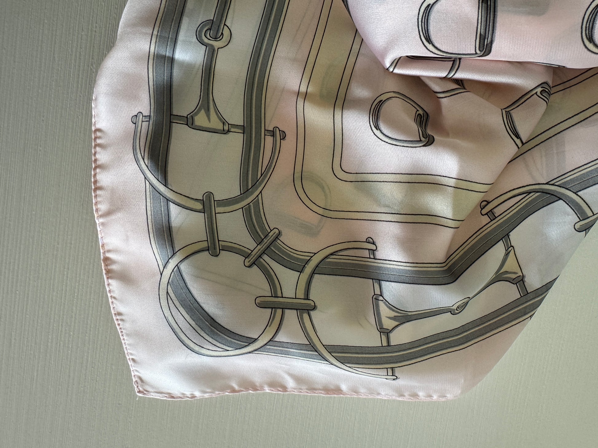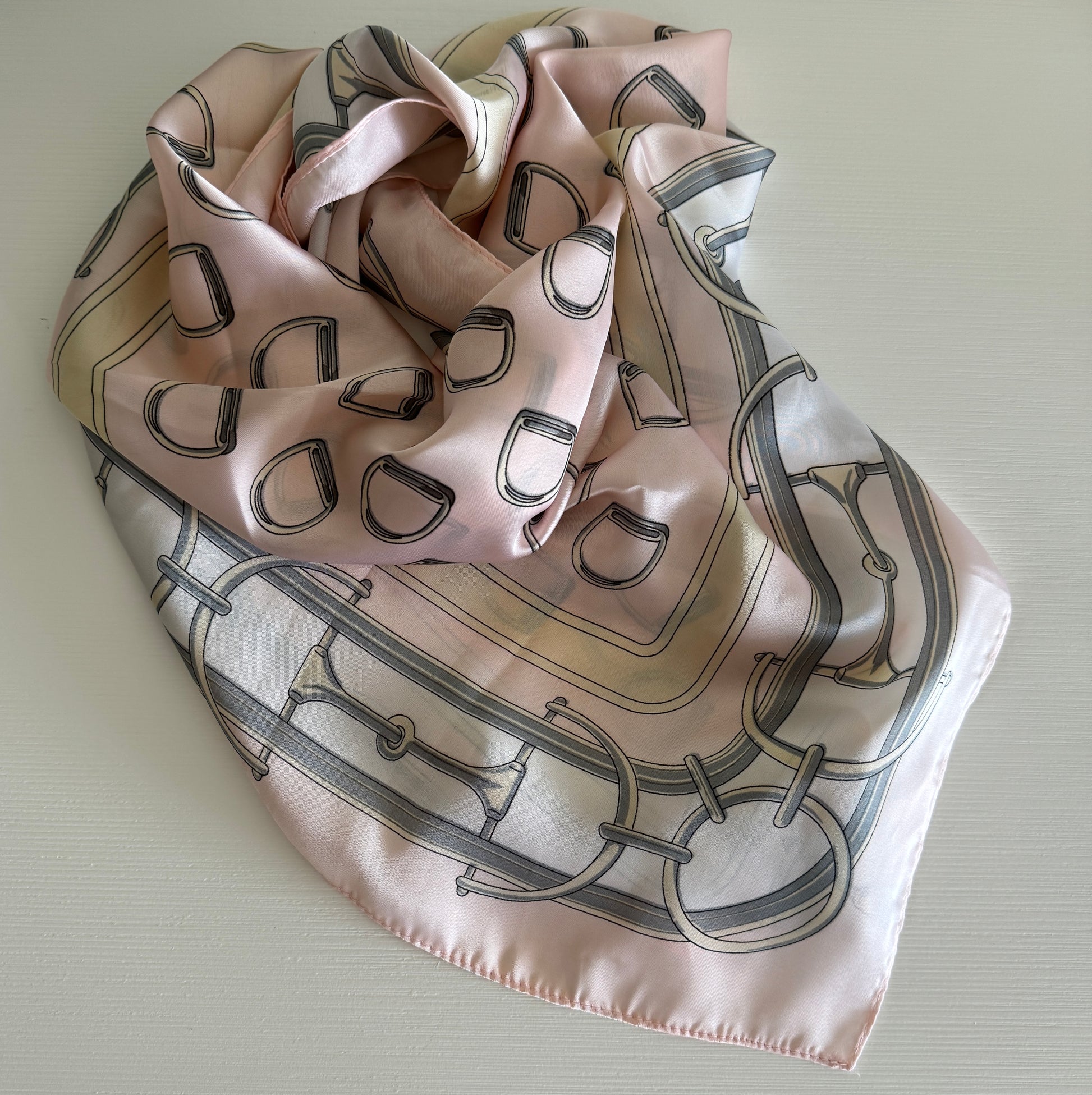 Beautiful baby pink scarf with bits around the borders and mini stirrups accents in grey, beige and white. Great color way. Measures a 27 inch square.