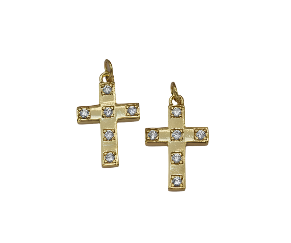 Cross charm with CZ detail. 14k gold plated and measures 22 x 14mm.