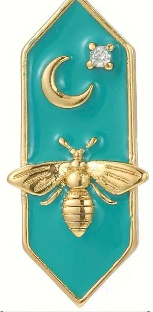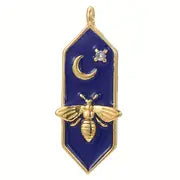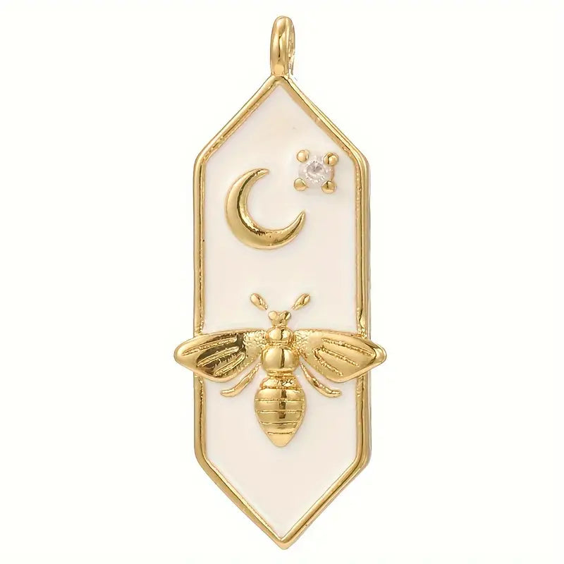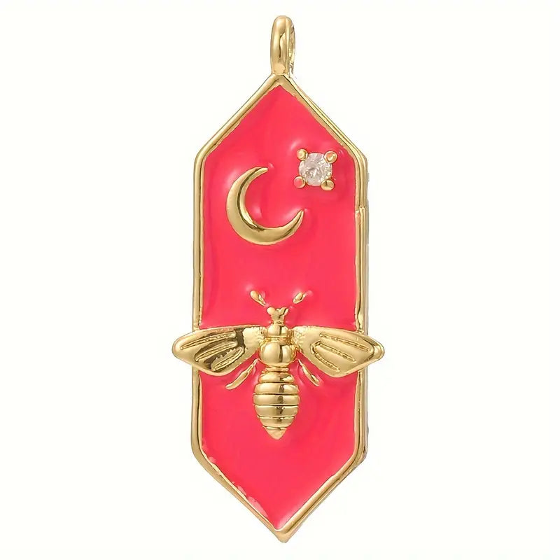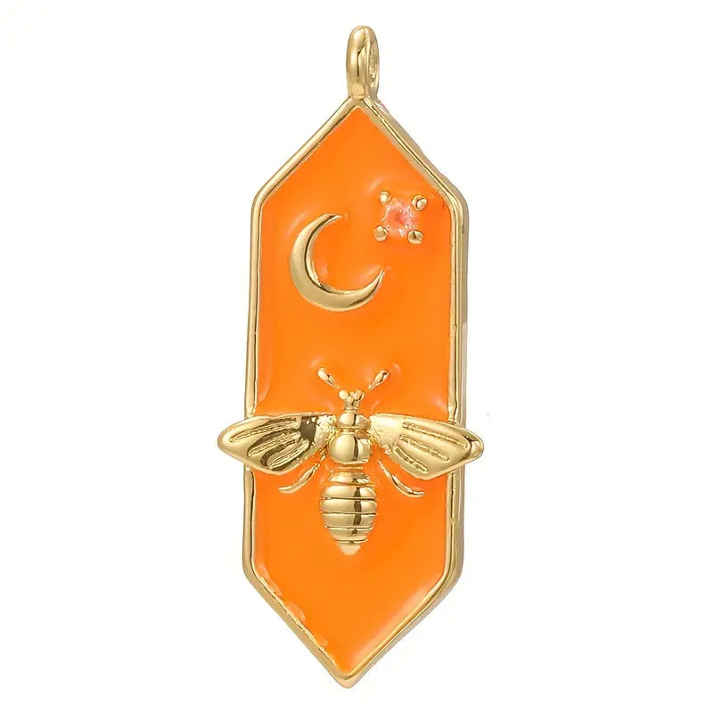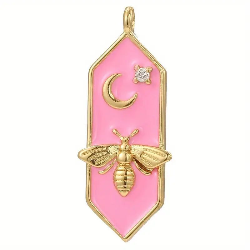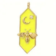 These enamel yellow gold plated pendants are bright, cheerful and make a colorful impact on any charm bracelet of necklace. A yellow gold plated bee and moon with a cz crystal make this pendant an eye catcher. Available in Whit, Hot Pink, Light Pink, Orange, Turquoise, Blue and Bright Yellow Enamel. Each measures 10mm x 24mm.