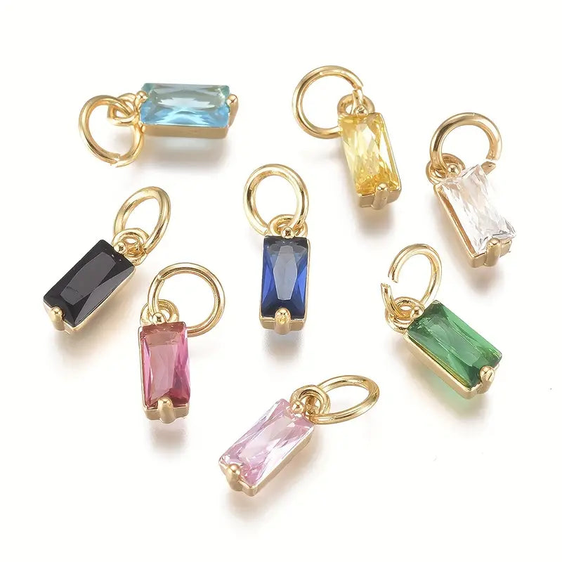 Cutest little colored gemstone charms. These are cut crystal to resemble various gemstones. Yellow gold plated and emerald cut. Please specify color on your order.