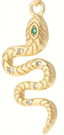 Our Snake Charm is gold plated with a green eye that would resemble an Emerald. Measures 30mm x 13mm. It is so good.