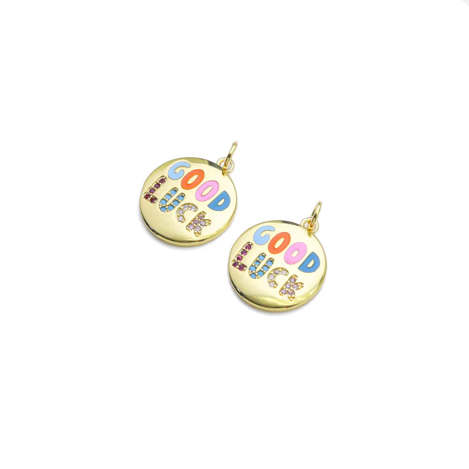 This is an adorable Good Luck Pendant. Letters are colorful enamel on a gold plated disc and measures 16mm.