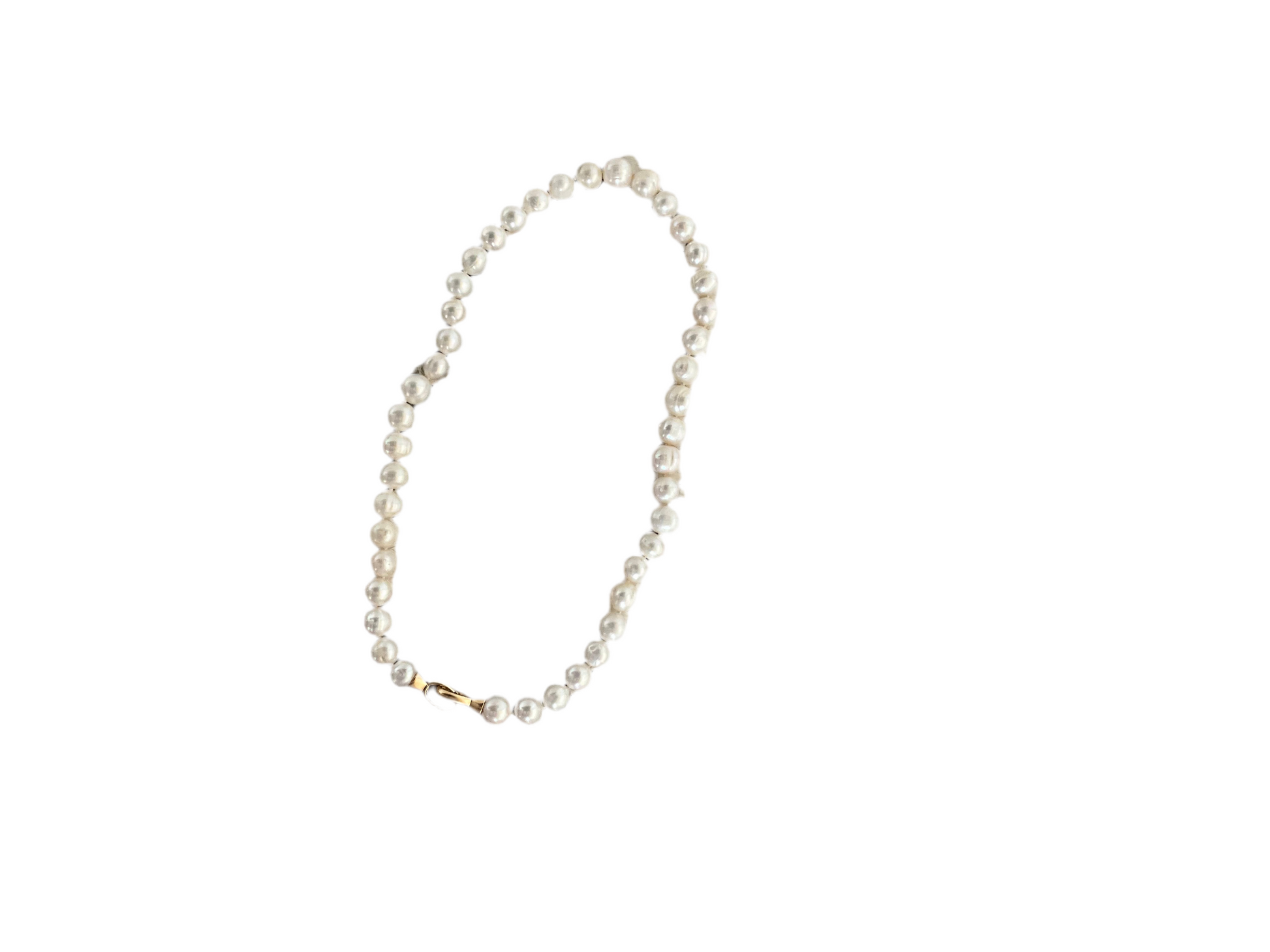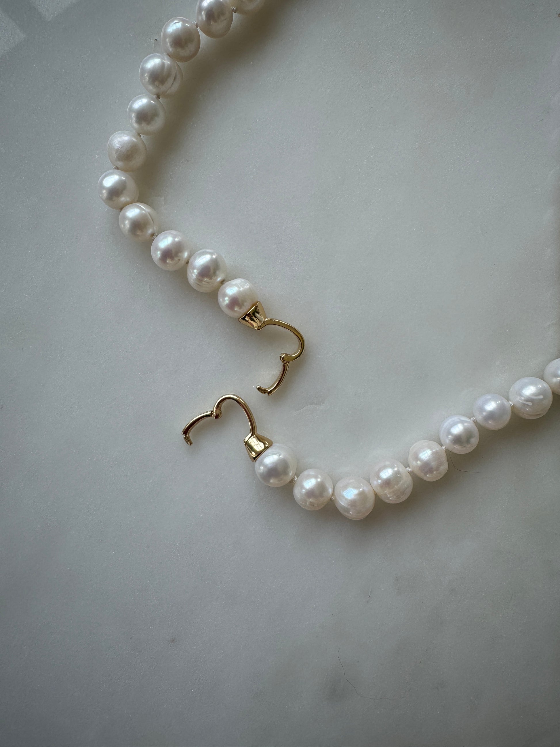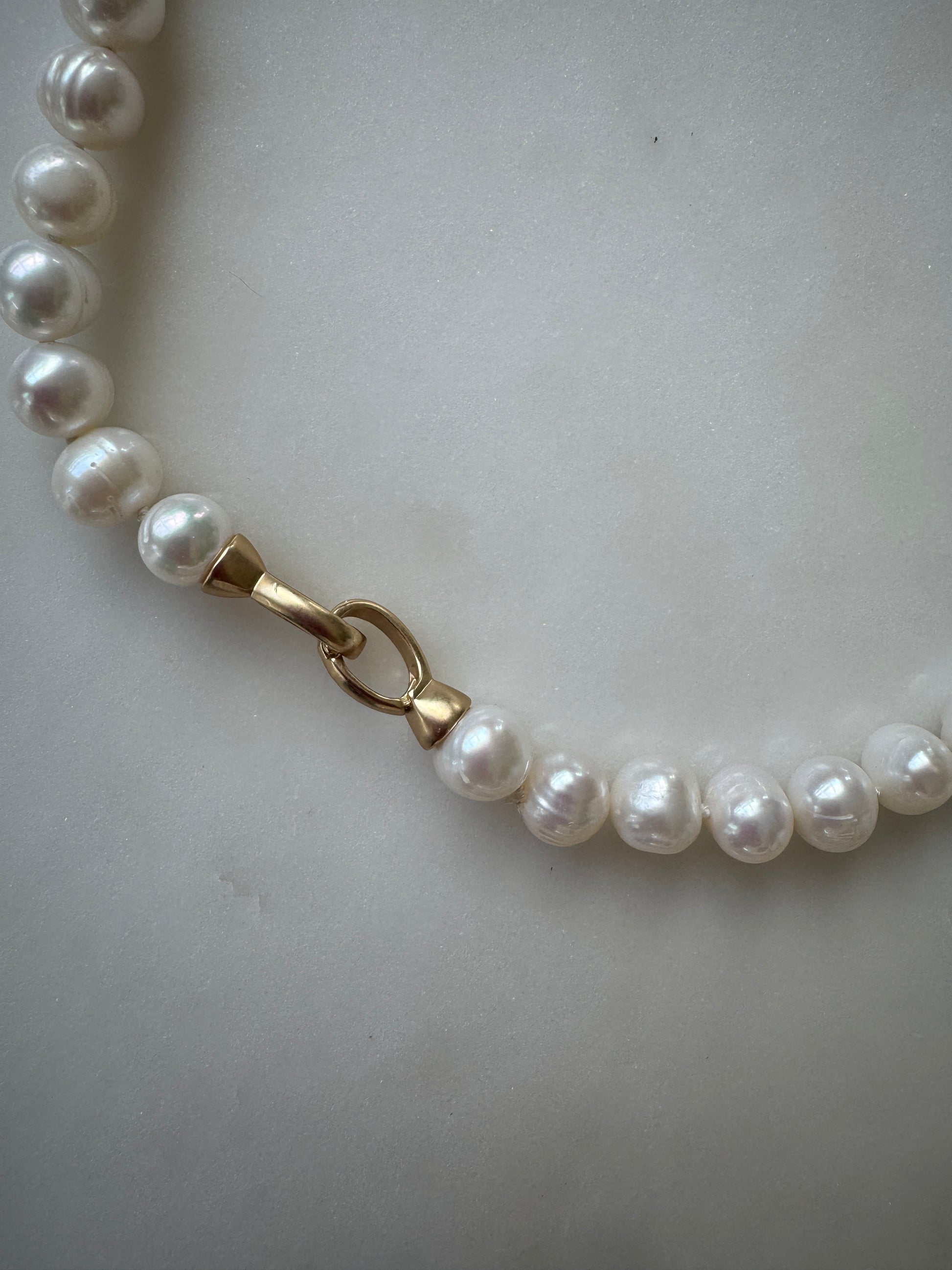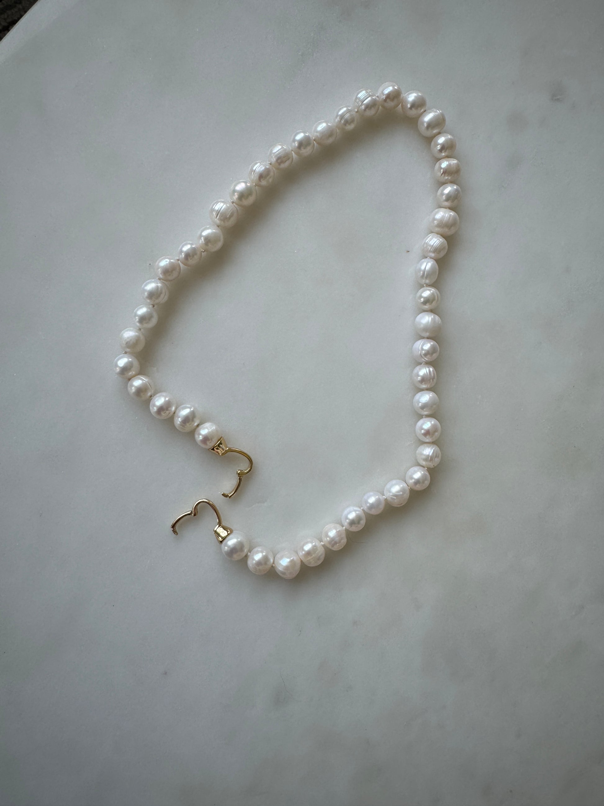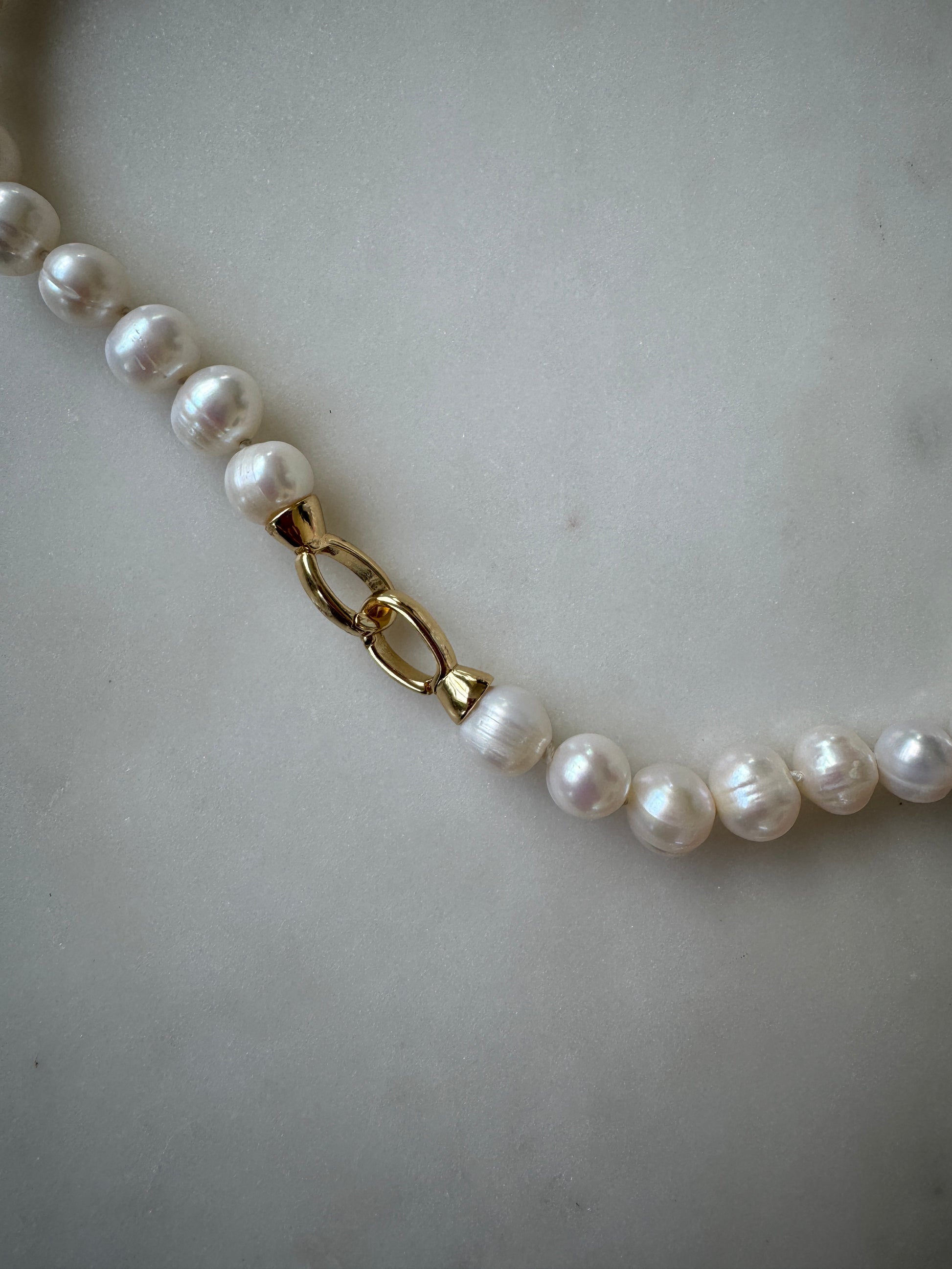 Our hand knotted 9mm Pearl necklace measures 16.5 inches long. The clasp can be worn in the back, or used in the front as a charm connector/clasp. Super versatile and one of our best sellers. Available in Brushed Gold, Shiny Gold and Silver.