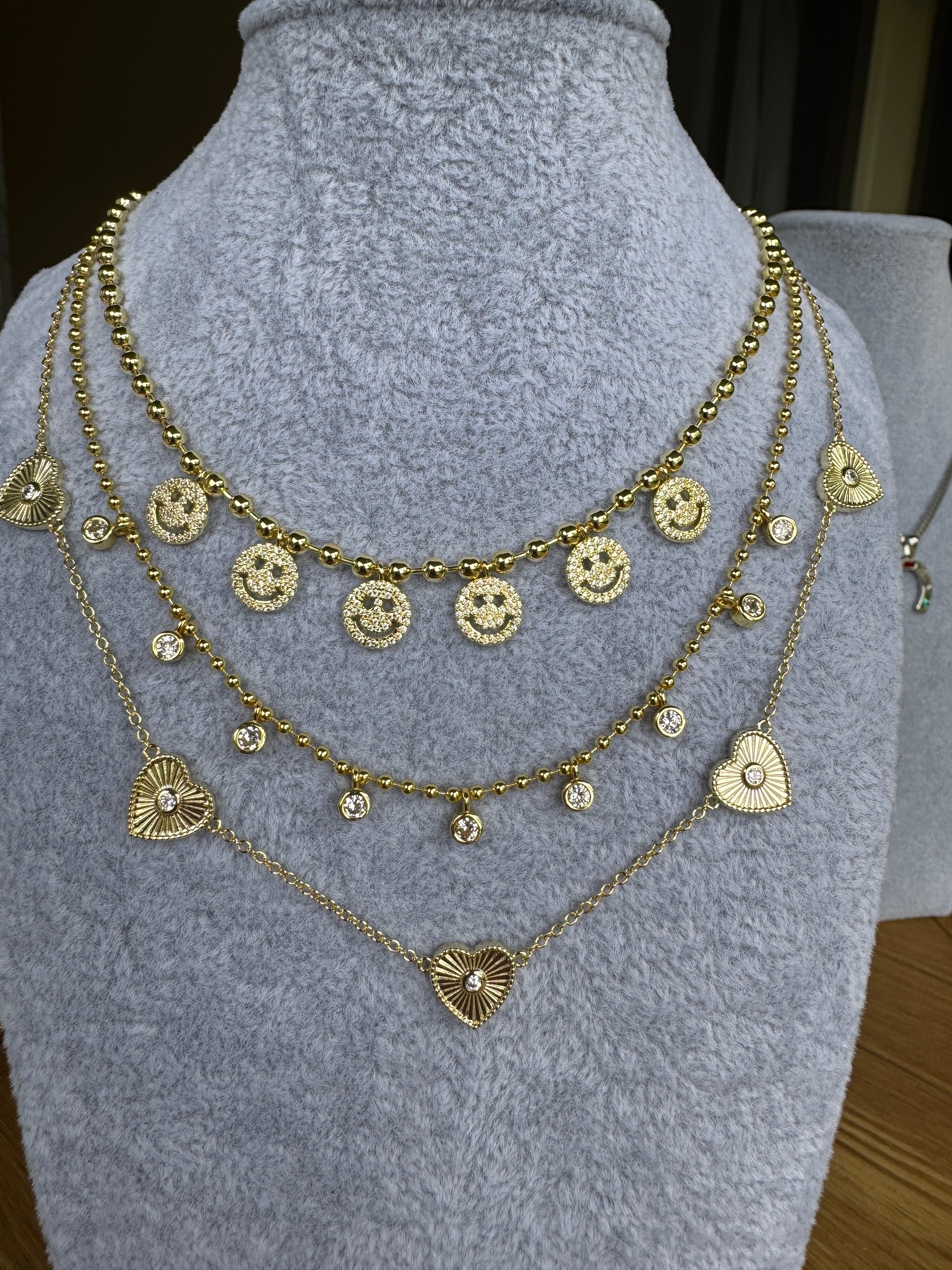 Our amazing Happy necklace is sure to bring a smile. 6 Diamond Smiley Faces on our Gold Plated Ball chain that is water resistant. Measures 16 inches.