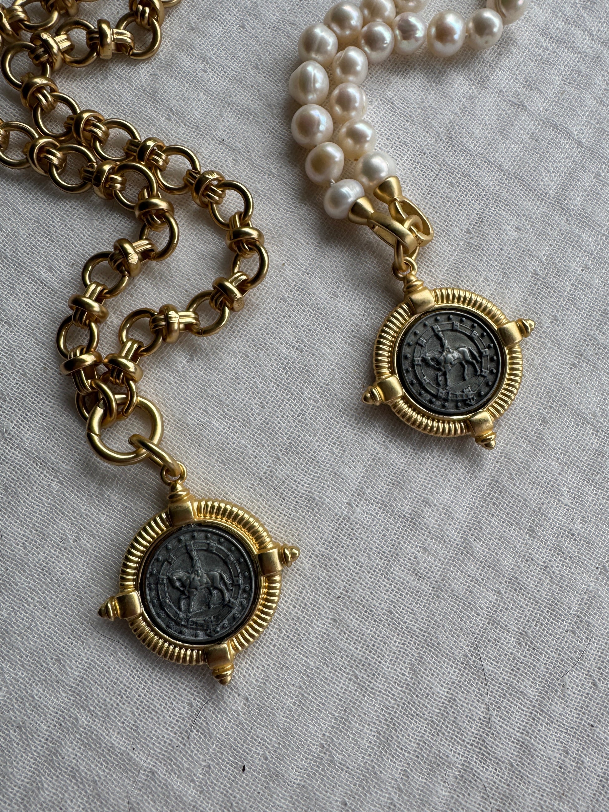 Our pendants our incredible. The detail, the heft, the style is all 10/10. For those that enjoy something more substantial, this Pendant is for you. Looks incredible with our Matte Gold Chain, Our Chokers or on one of our Pearl Necklaces. Measures 38mm and is Gorgeous.