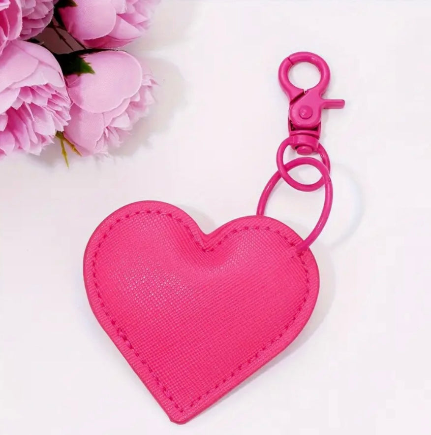 Adorable Putty Hot Pink Leather Heart with attached Hot Pink Key Ring and Bag Clip. Use in a variety of different ways. Such a conversation piece and makes a great gift. (Second photo belongs to a customer. Use for inspiration.)