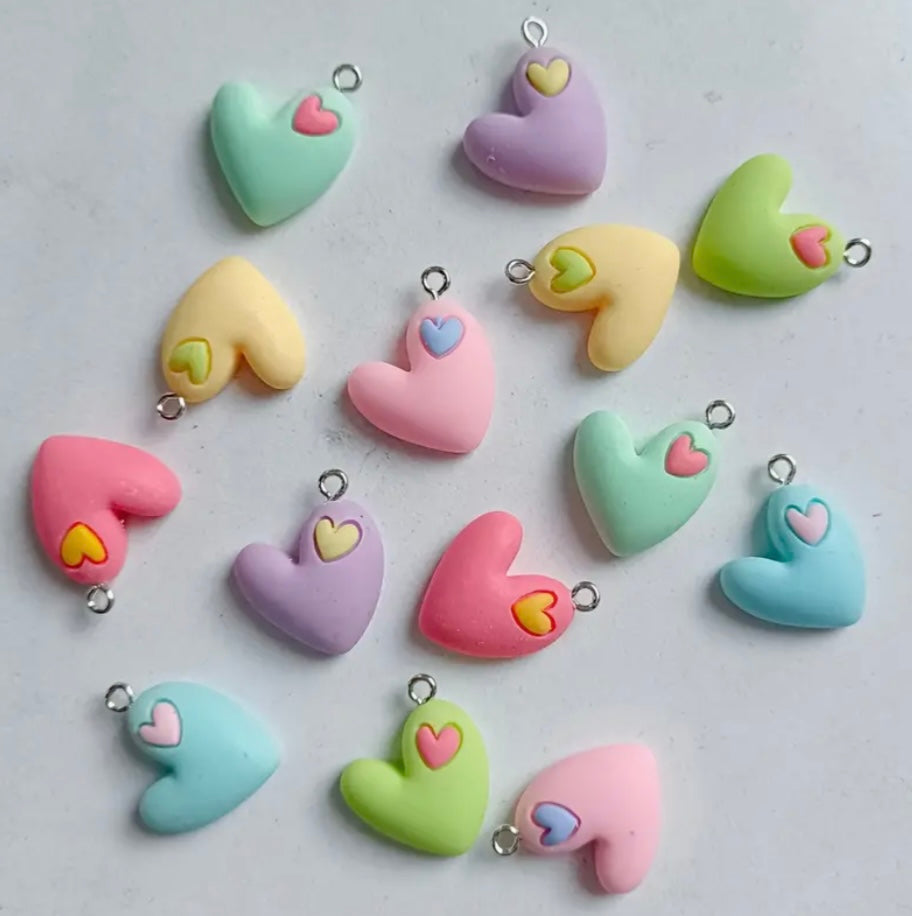 These resin heart charms have a little heart in a different color that makes them so whimsical and adorable. Finished with a silver lobster clasp. Please specify color you would like in your order notes. Thank you. :)