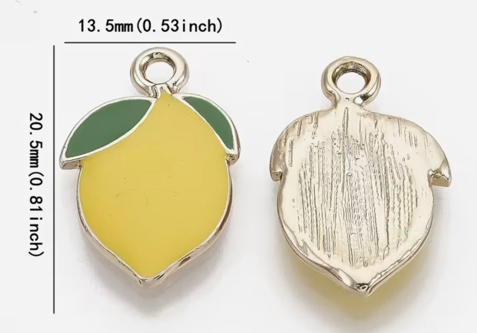 This bright and shiny lemon charm is enamel on base metal and measures 13.5 x 20.5 mm.