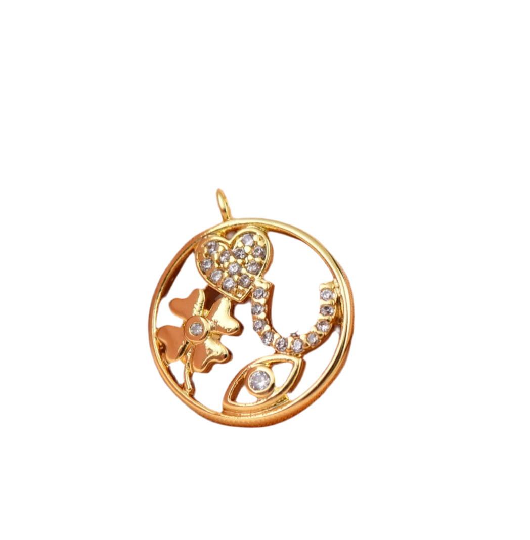 This charm has four of our most recognizable lucky characters represented beautifully. The four leaf clover, the lucky horse shoe, the evil eye and a heart.