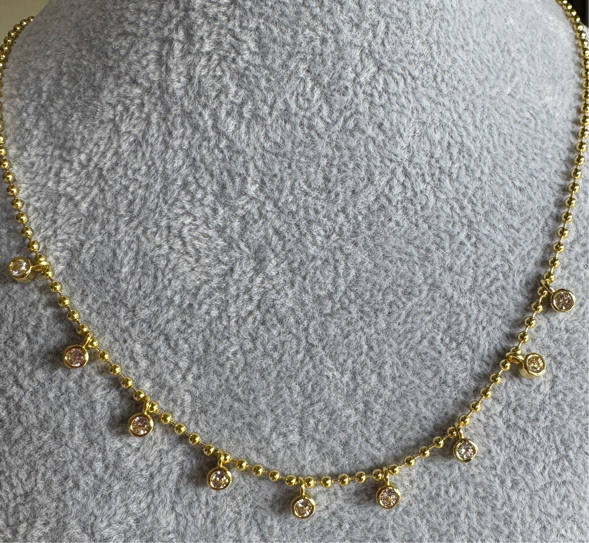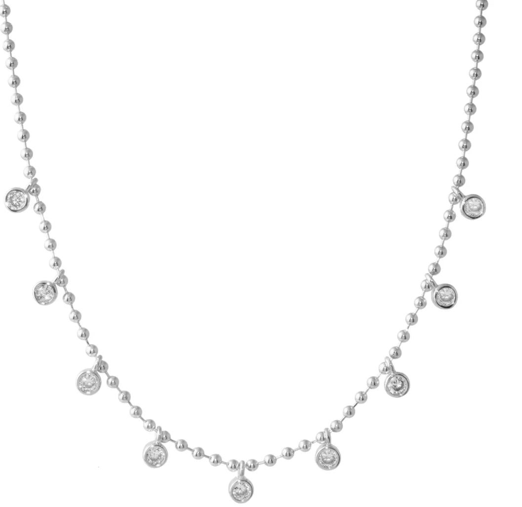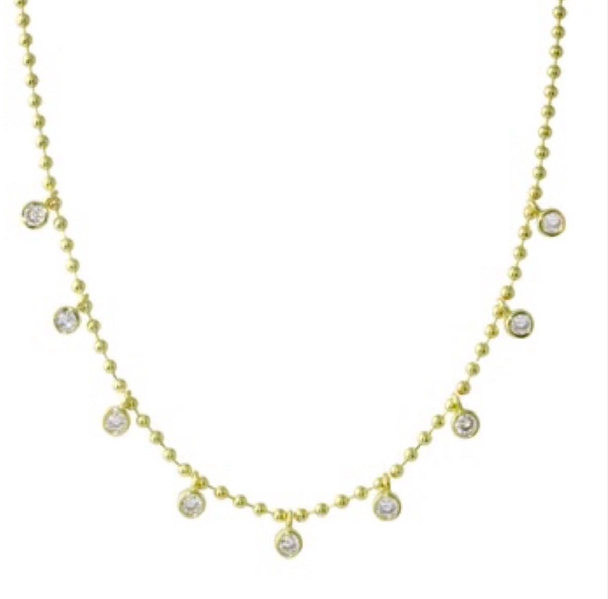 Beautiful necklace with 9 bezel set stones. 14 inches with 2 inch extender chain and lobster clasp. Available in gold and silver and is water resistant.