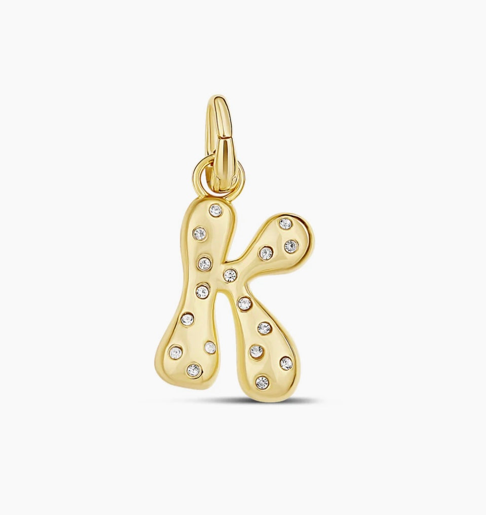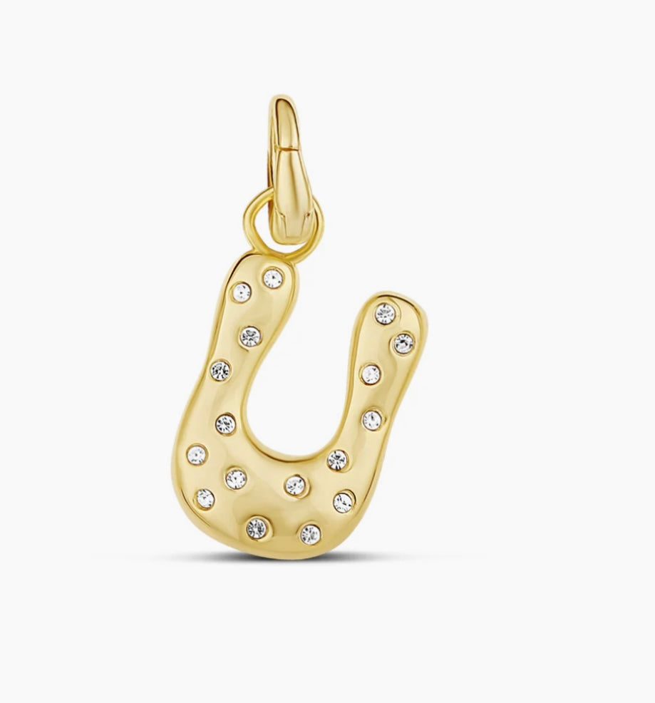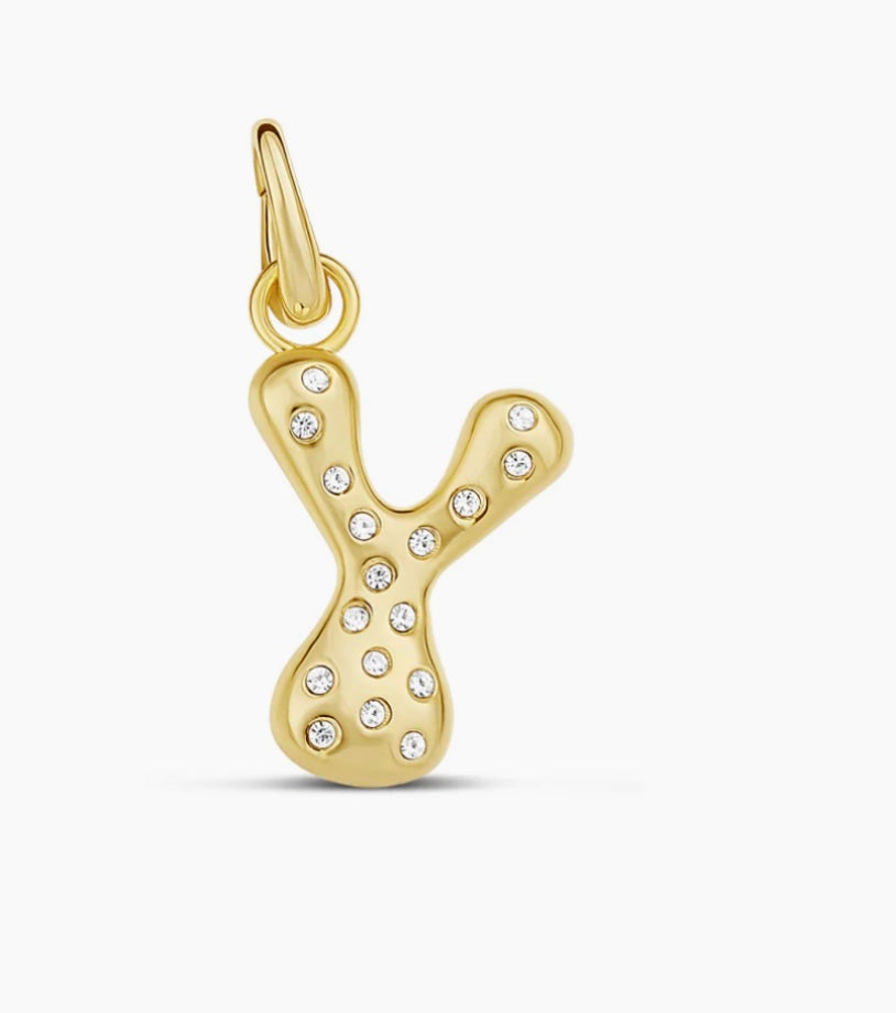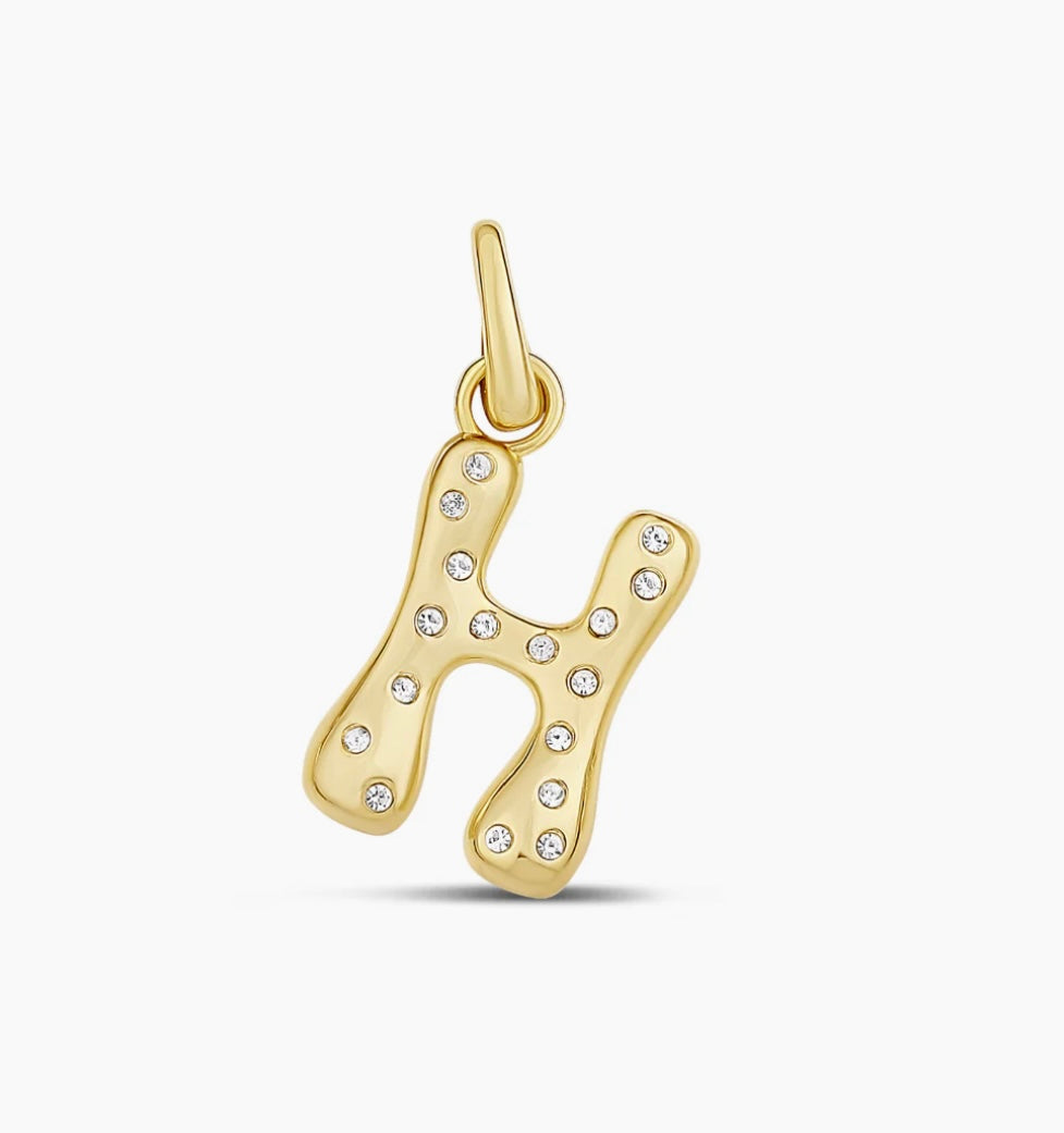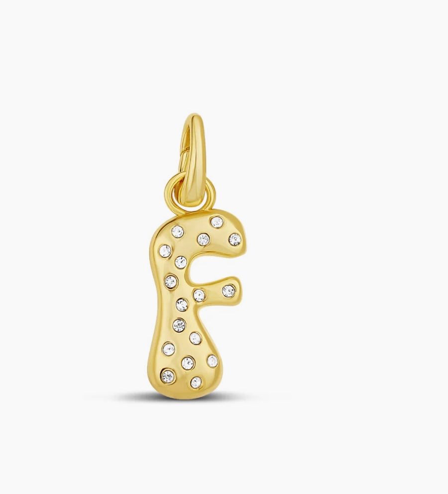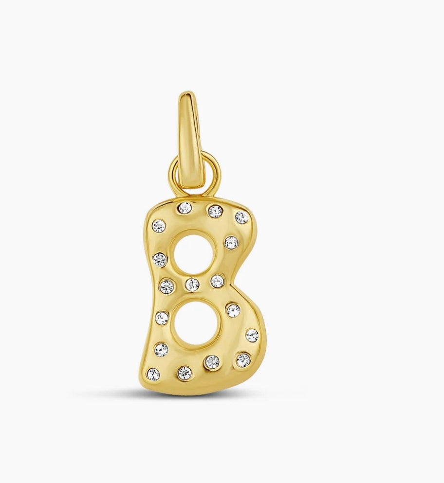 Our Pave Drip letters have the perfect amount of sparkle and are such a statement. This glossy, gold initial charm brings a playful twist to personalization with its bold, bubbly design. The heft is so nice and what’s unique about these is the clasp. It has a hinge clasp to make it easy and fun to move from item to item. SO GOOD. Tarnish resistant, done in 18k gold plating over brass and is measuring 20mm.
