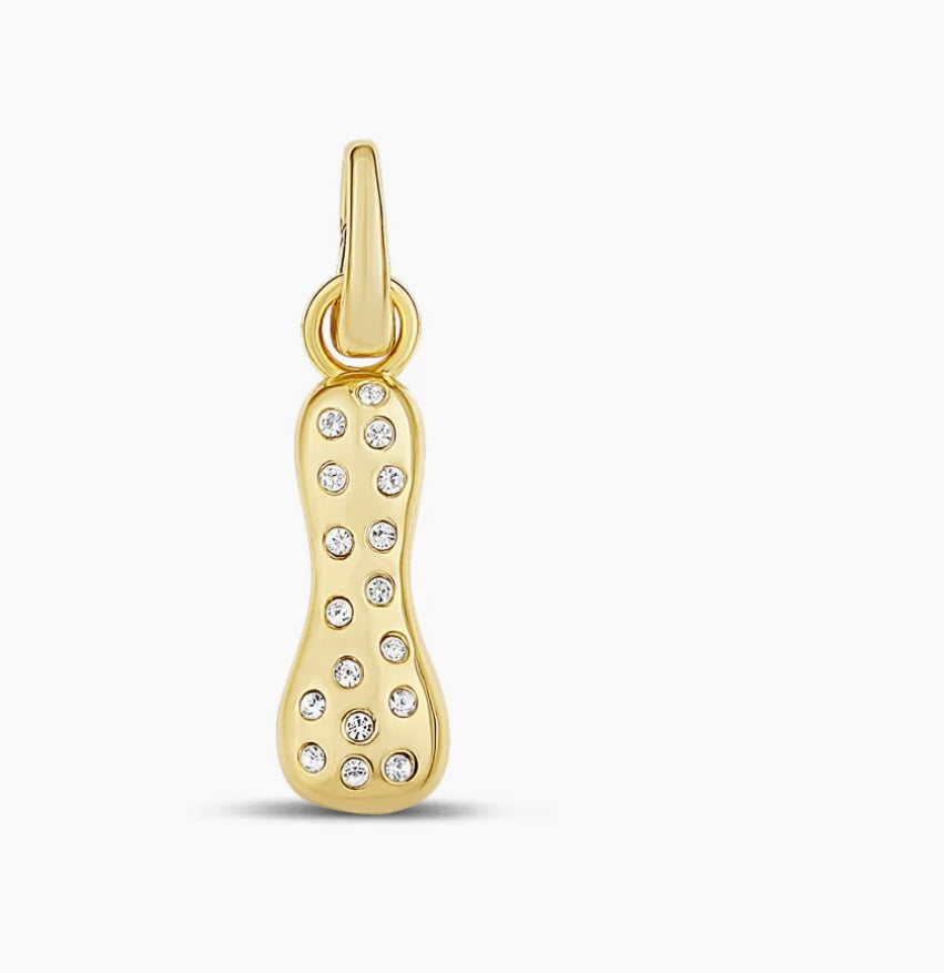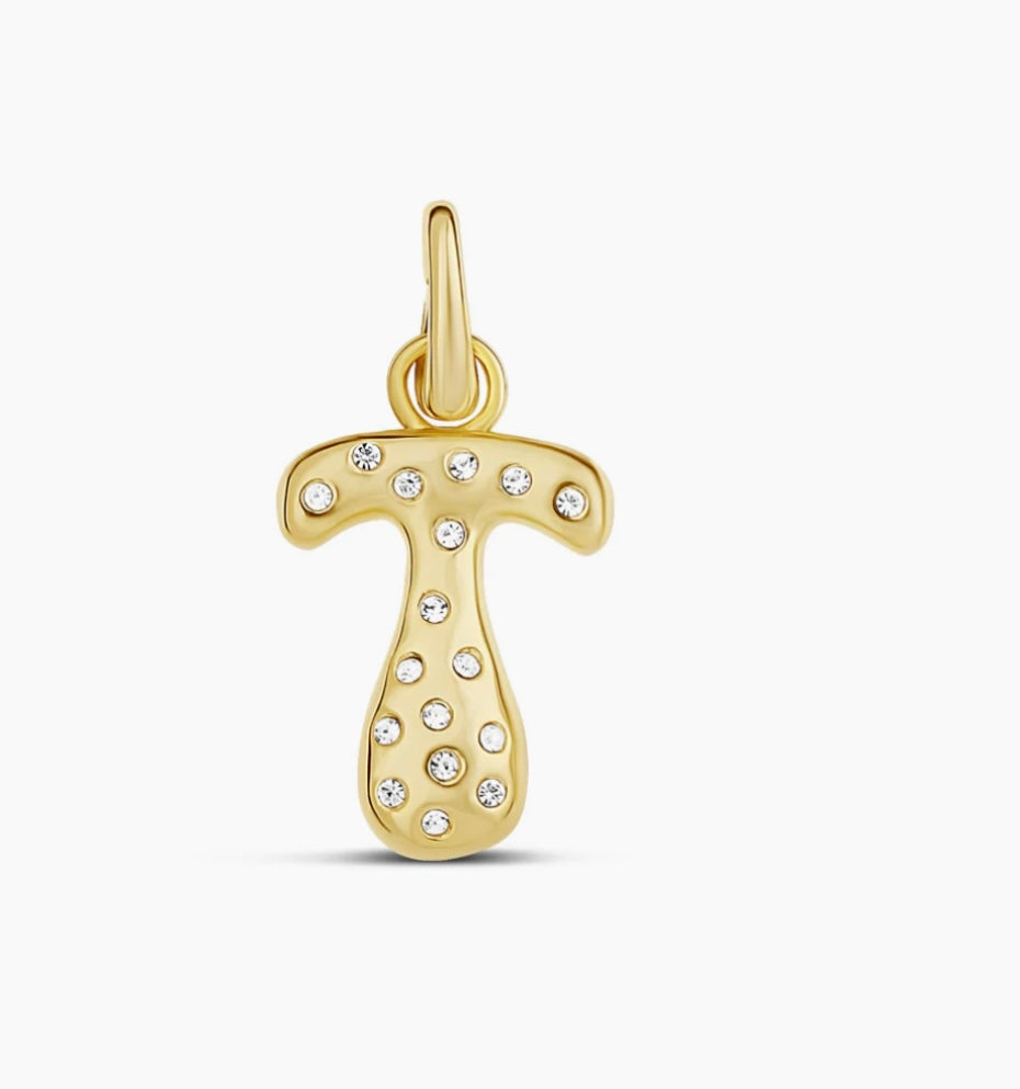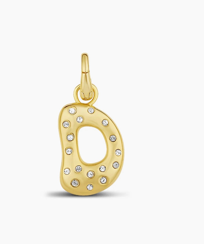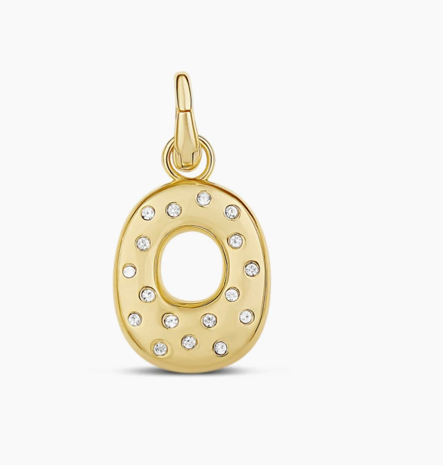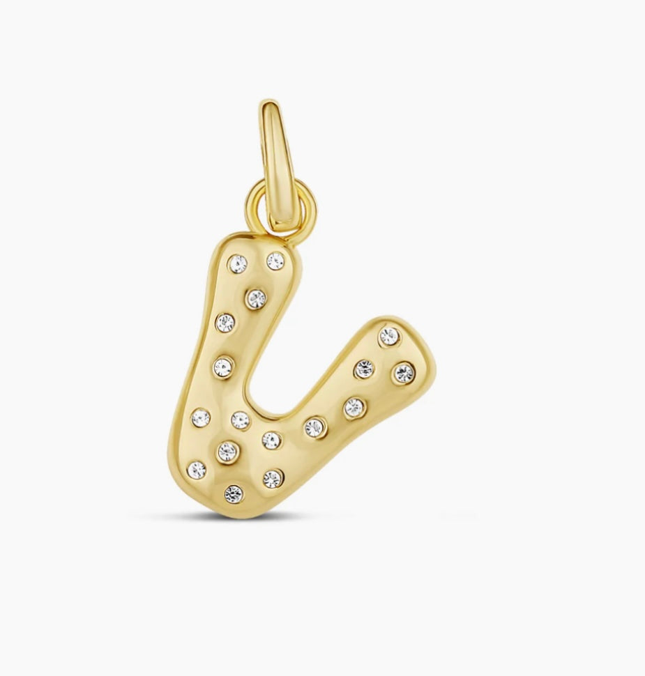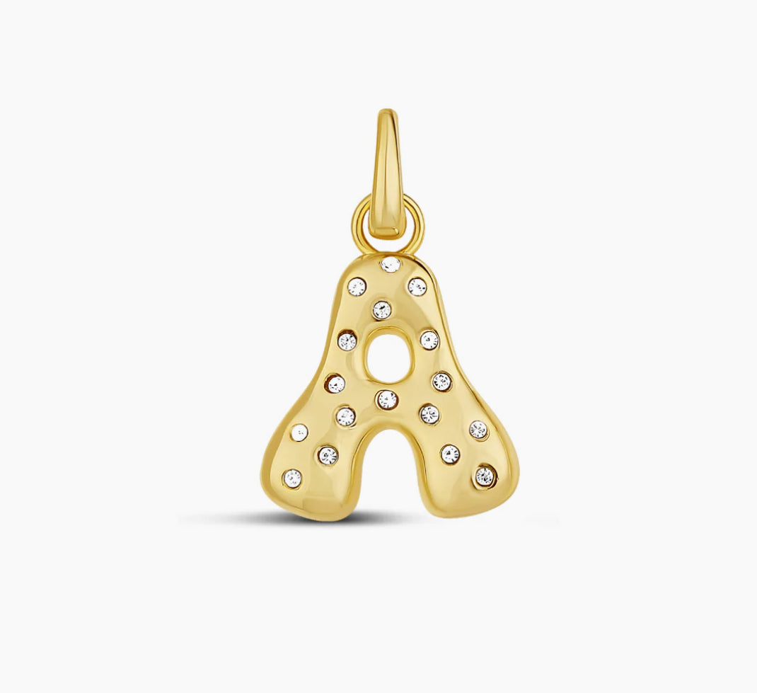 Our Pave Drip letters have the perfect amount of sparkle and are such a statement. This glossy, gold initial charm brings a playful twist to personalization with its bold, bubbly design. The heft is so nice and what’s unique about these is the clasp. It has a hinge clasp to make it easy and fun to move from item to item. SO GOOD. Tarnish resistant, done in 18k gold plating over brass and is measuring 20mm.