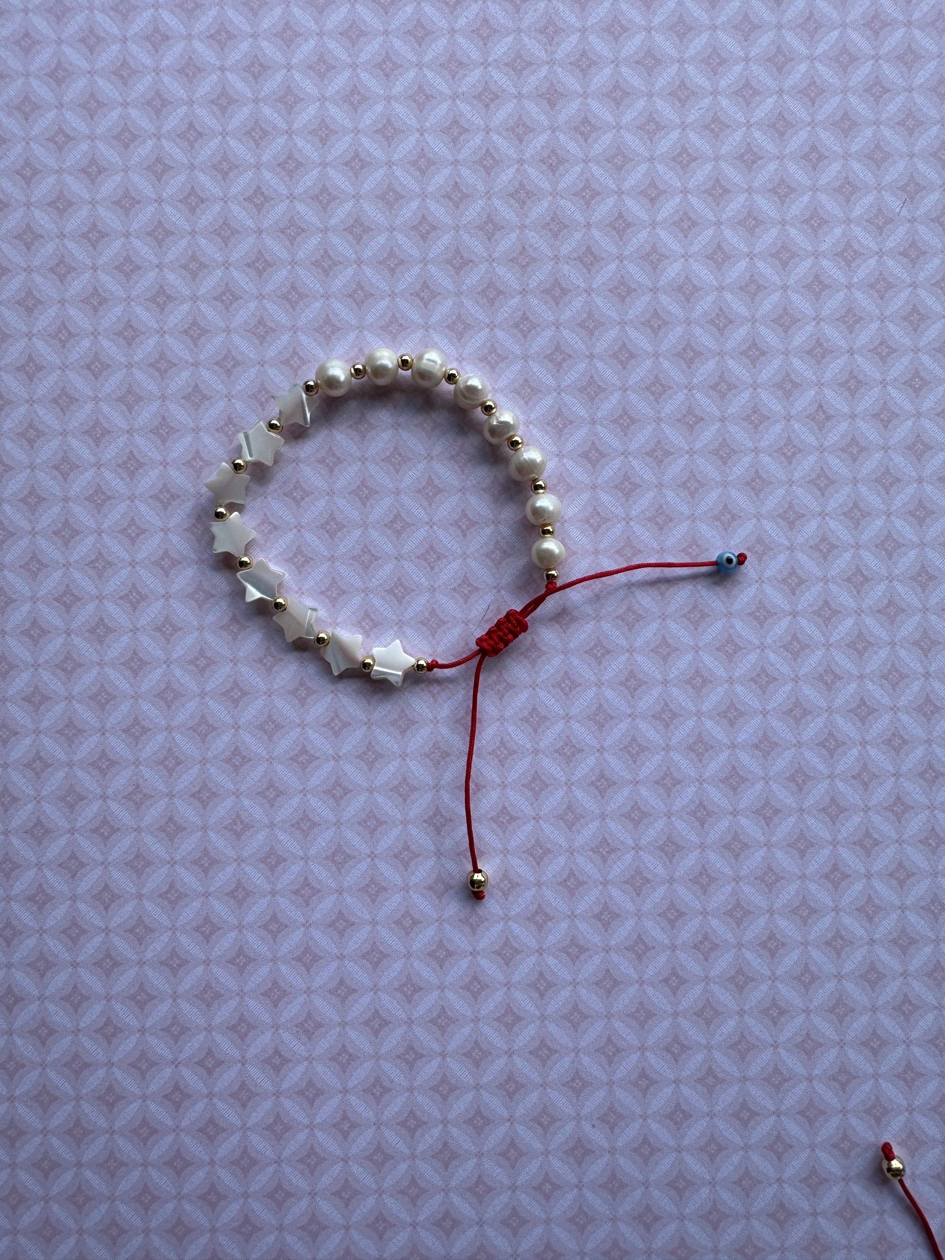 ON SALE NOW - our one size fits most star and pearl bracelet with gold accents. Done on red silk with the cutest little evil eye detail on the end of the string. We love this pop of color. Get one while the close out price lasts.