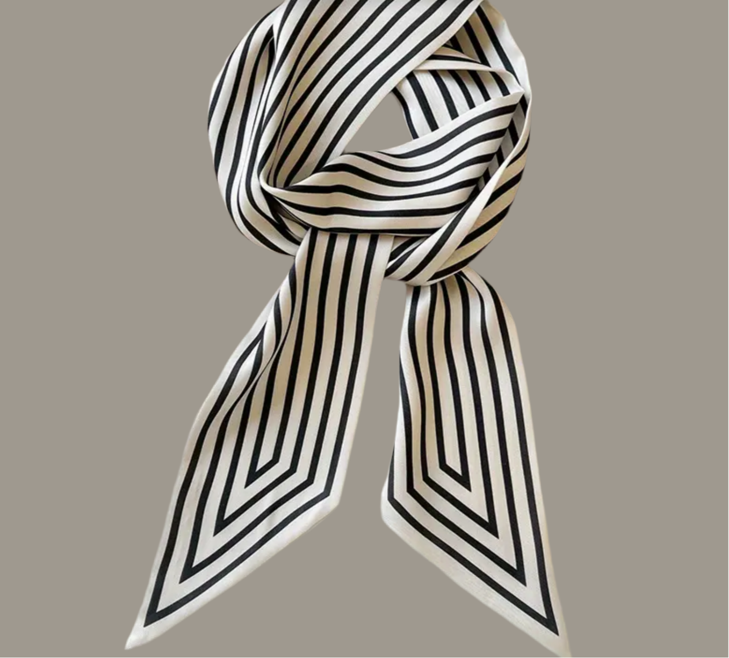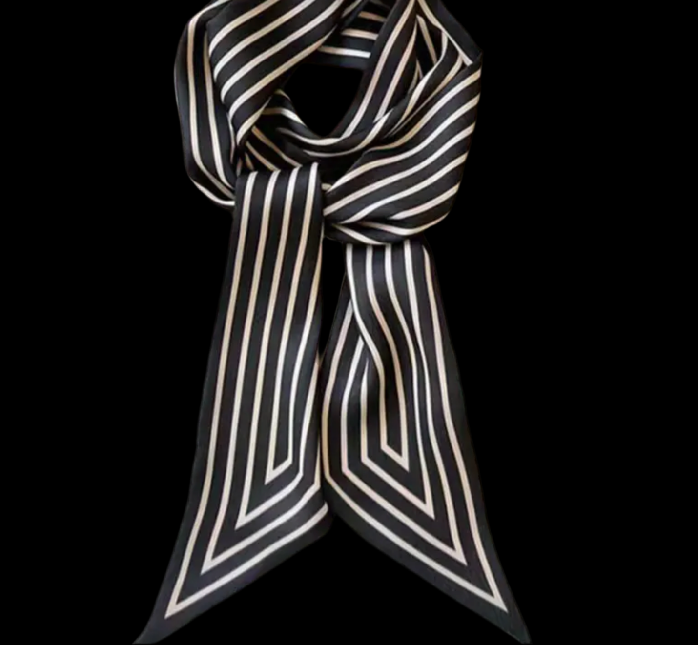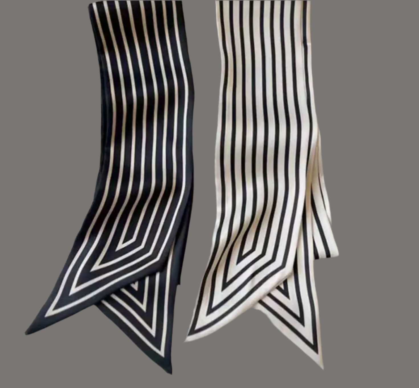 These ribbon scarves are so versatile with many different ways to style them. Available in Black and Ivory. Wear around your neck, your ponytail, wrist, around your bag, as a headband, braid thru your braid … around the brim of a hat, SO many options. 38 inches in length and 2.3 inches wide.