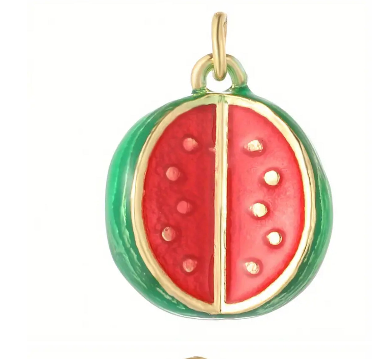 This watermelon charm is enameled, bright and colorful and is round. Has some heft to it at 6 grams, and is super fun. Measures 13.5 x 13 mm.